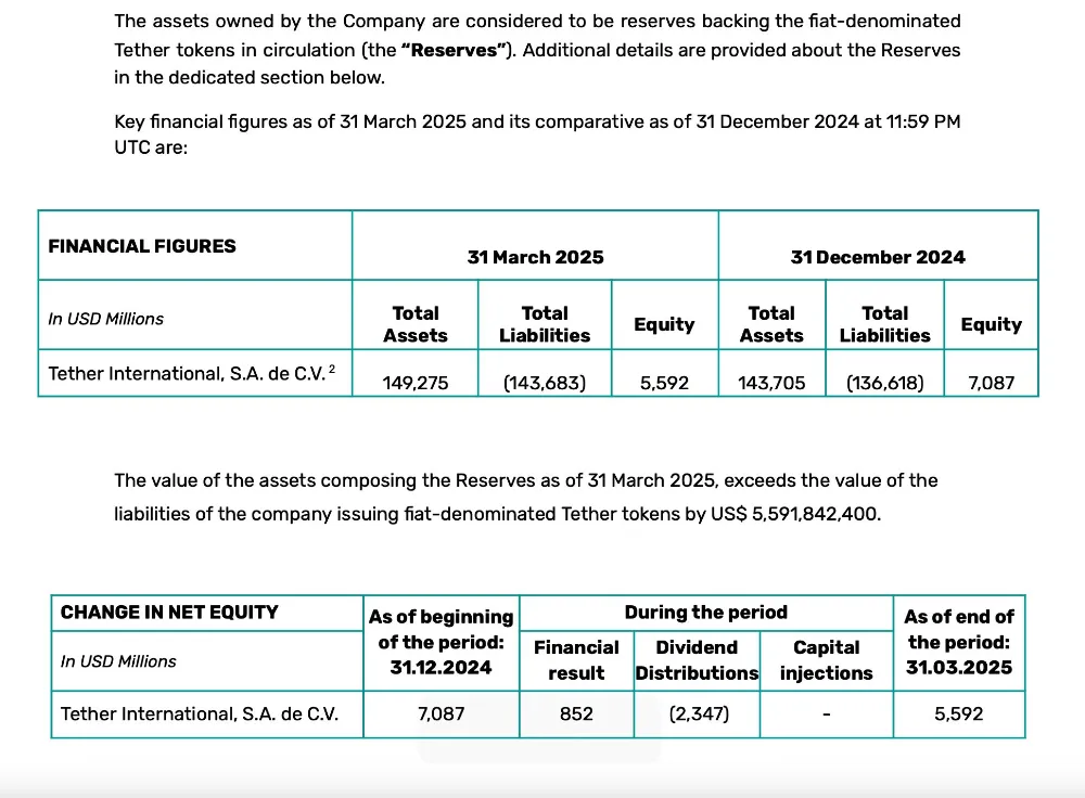 By March 31, 2025, Tether had $149.3 billion in total assets and $143.7 billion in debts—mostly connected to its stablecoins. Although its extra reserves dropped from $7.1 billion in late 2024 to $5.6 billion now, it still has more than it needs to back its USDT tokens.